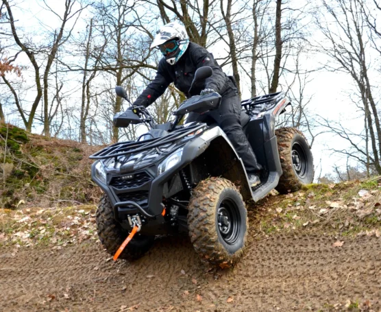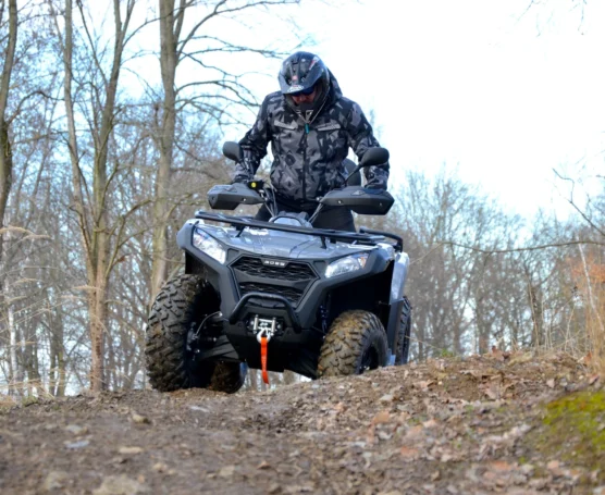 Lano navijáku operuje bezpečně v horizontálních a vertikálních rolnách, navíc je tento technický prvek dobře chráněn předsunutým rámem. Ovládání navijáku je elektronické z řídítek stroje.