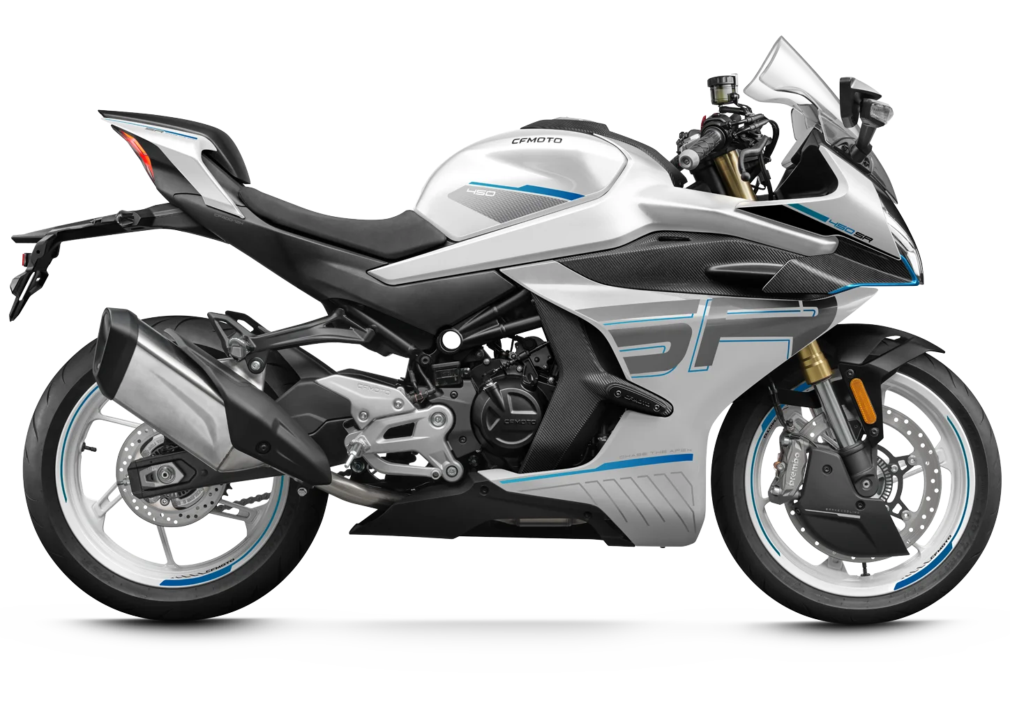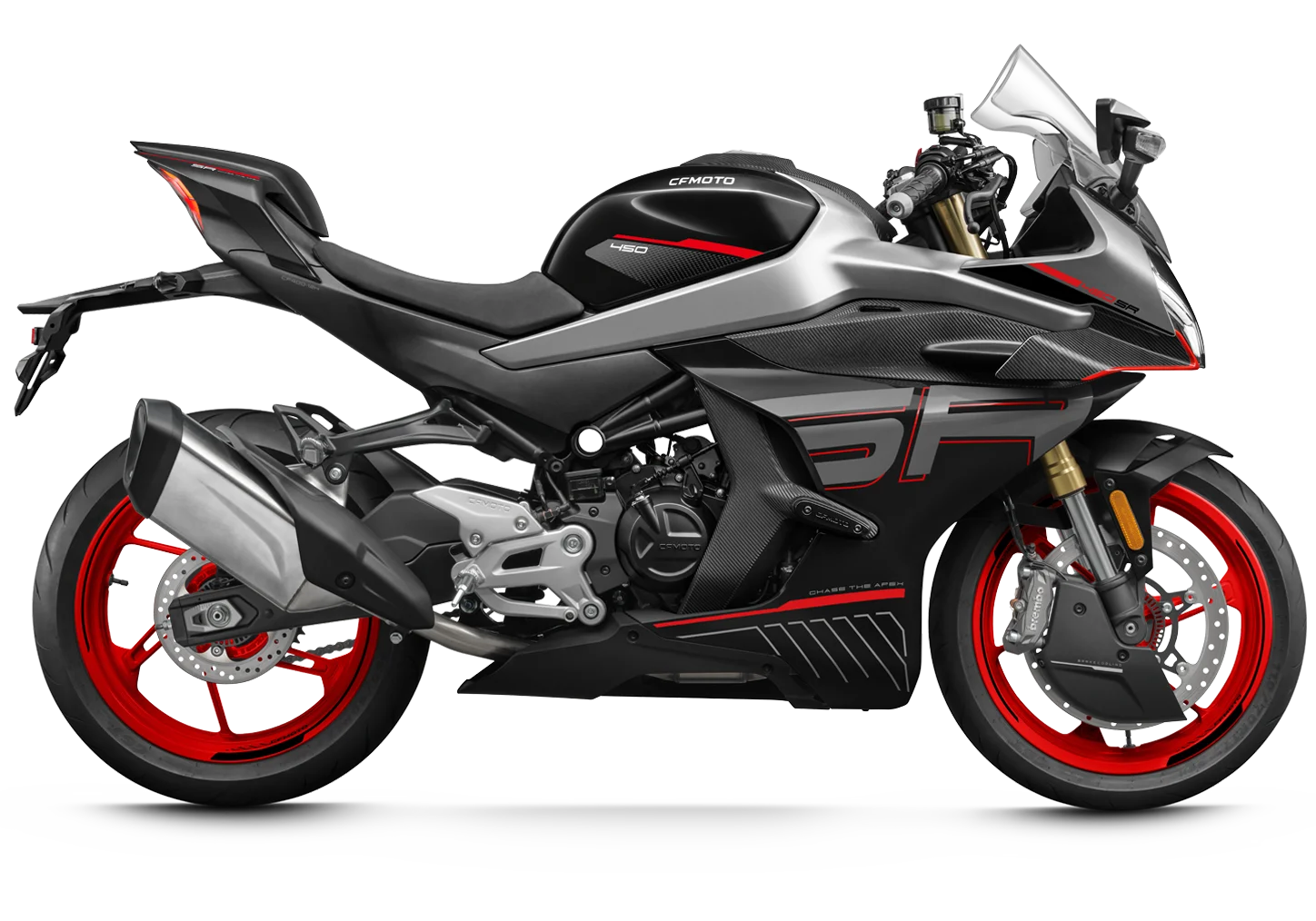 Stejně jako u ostatních modelů rodiny CFMOTO, i u 450SR tvoří LED světla dominantní designový a funkční prvek. Tato technologie dodává motocyklu nezaměnitelný, dravý výraz a zároveň jezdci garantuje špičkovou viditelnost, která je u supersportovního stroje klíčová pro bezpečnost.
